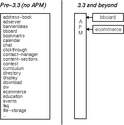 For a simple illustration of the difference between ACS without APM (pre-3.3) and ACS with APM (3.3 and beyond), consider a hypothetical ACS installation that uses only two of the thirty-odd modules available circa ACS 3.2 (say, bboard and e-commerce):