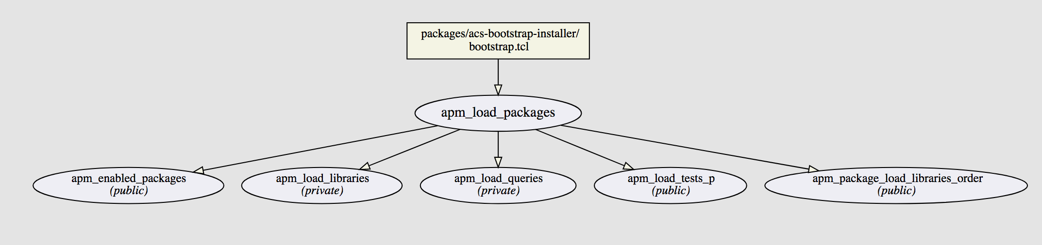 The second example shows the call-graph of the API call apm_load_packages, which is called by a init file and calls serval other functions.