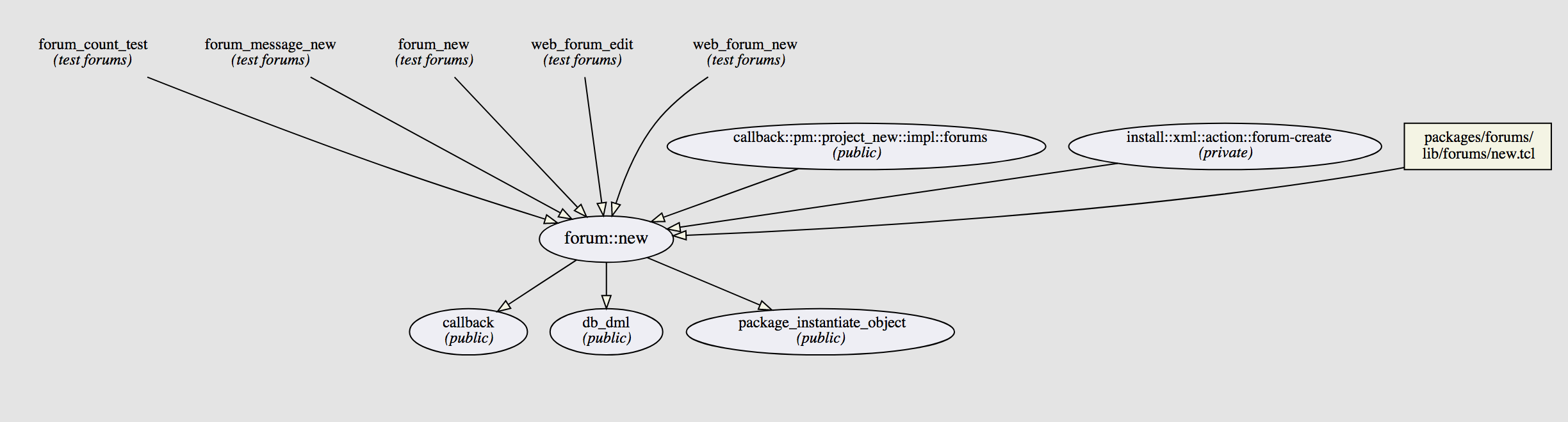The API browser shows per API call a dynamically computed partial call-graph, which contains at most 5 calling and 5 called functions, and omits recursive calls to get a nice layout. Below are two example call-graphs from the forum::new and pm_load_packages API calls. The function "forum::new" calls the three displayed API functions, is called by two API calls and the lib/forums/new ADP include, and is covered by 5 test cases.